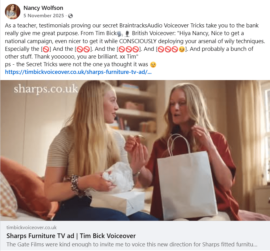 One of @NancyWolfson‘s sparkly gems helped me smash a session today. Client went from “that’s fine” to DELIGHTED. #voiceover